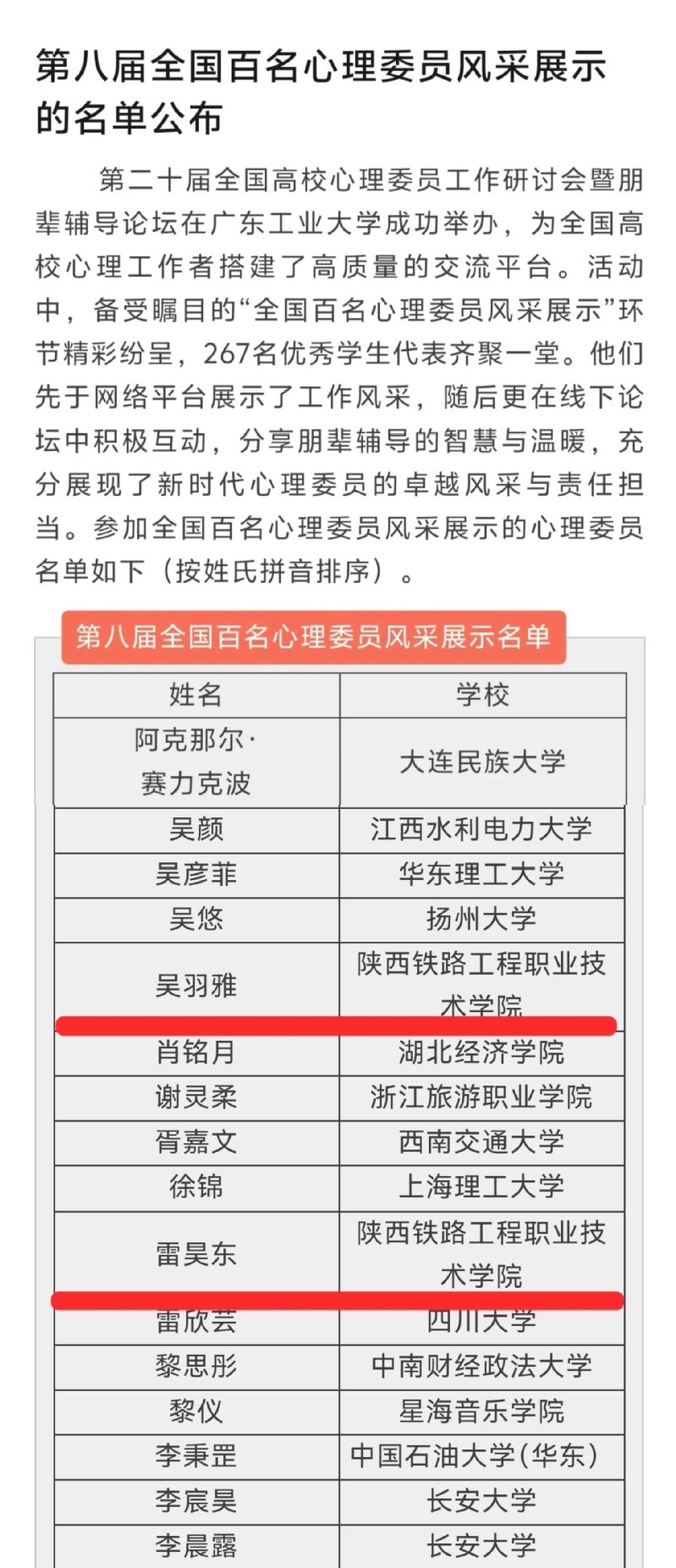 近日,第二十届全国高校心理委员工作研讨会暨朋辈辅导论坛在广东举办,本次会议特别设置了“第八届全国百名心理委员风采展示”活动,通过校内评比推荐,全国网络投票和线下论坛全国风采展的激烈角逐,陕铁院铁道运输学院城运3232班吴羽雅、铁道装备制造学院机电3245班雷昊东两名同学成功入选“第八届全国百名心理委员风采展”,陕西高职唯一。